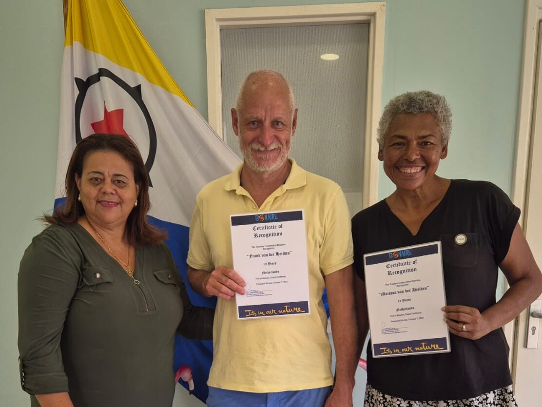 This includes Frank and Marissa van der Heijden from the Netherlands, who were honored for visiting Bonaire over the past 12 years. The couple has been visiting Bonaire since 2012. “What attracts us most to Bonaire is the island’s culture and the friendly people. We also love Bonaire’s krioyo (local) food and the many diving spots the island offers,” said Frank and Marissa van der Heijden.