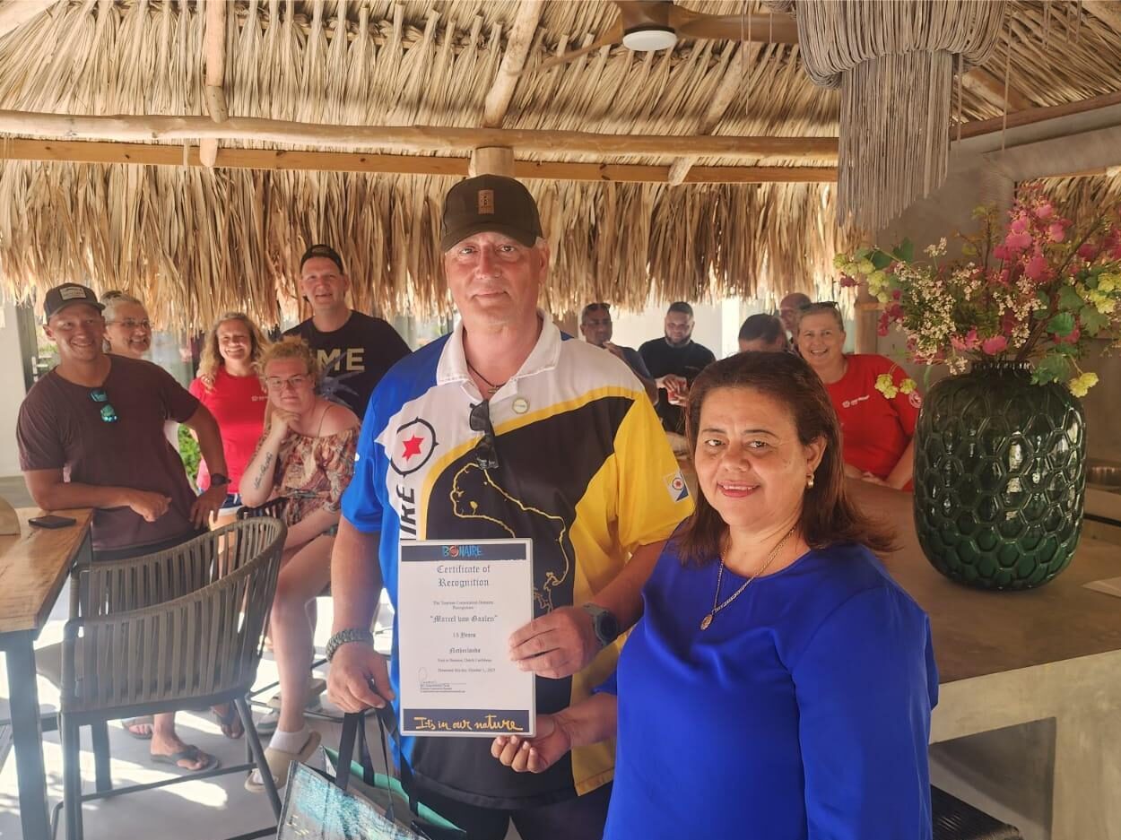 Richard Reiter from the United States was also honored. Richard has been visiting Bonaire for 40 years and has led a group of divers made up of dentists for at least 30 of those years. Over the years, the group has stayed at various accommodations around the island. “I remember getting certified in 1985 at the old Bonaire Beach Hotel, which no longer exists,” said Richard, who continues to visit the island every year. On this occasion, a plaque was presented to Richard Reiter.